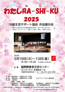 このたび大阪生活サポート協会の表現活動支援の一環として当協会のホームページ作品展示コーナーにご応募していただいた作品を展示した「大阪生活サポート協会作品展示会~わたし RA-SHI-KU(らしく)2025~」を堺市にある国際障害者交流センター(ビッグ・アイ)にて本年も開催いたします。当日は、皆さんが思いを込めて作成した絵画・手芸・イラスト・書や写真など思い思いの作品を展示いたします。